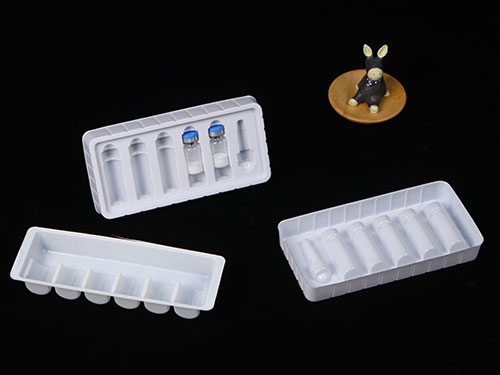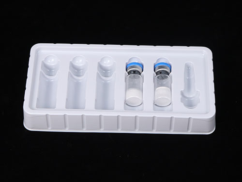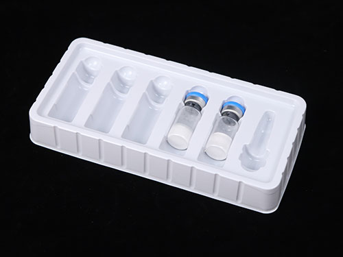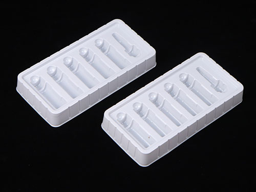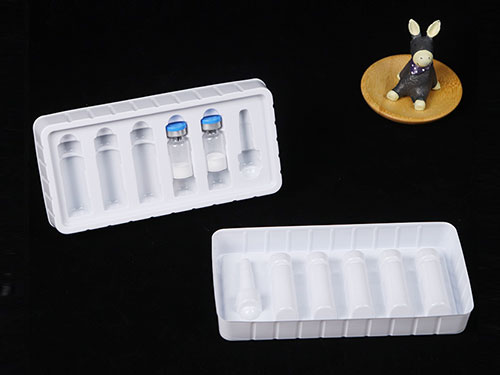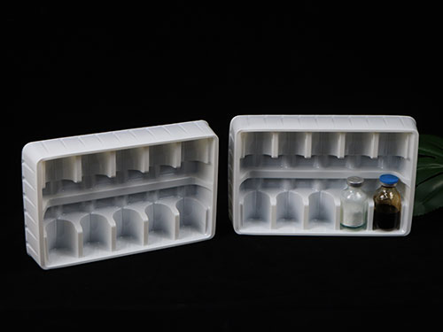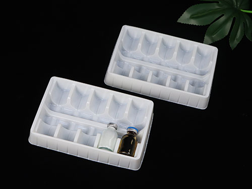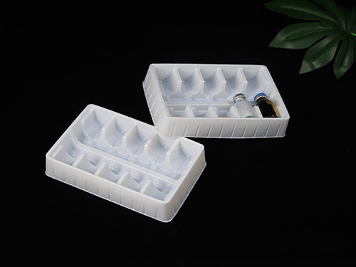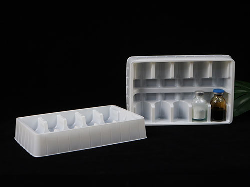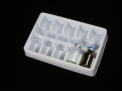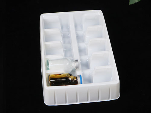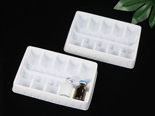西林瓶托盘(西林瓶塑托)是较为常见的一种医药包装,它是一种塑料材质的内置托盘,所以为被称作水针内托,作为塑料外包装的内衬使用。通常采用吸塑工艺将塑料硬片按照实际要求加制成具有特定凹凸内槽的托盘形状,将托盘置于纸箱或塑料袋等二次包装容器之内。水针剂产品被置于针剂托盘的凹槽内,对针剂起到固定和保护作用,同时也对产品外观起到了美化的作用。吸塑工艺在加工中,使PVC光片受热经过真空吸塑成型,具有易成型、成本低、档次高的特点。如果在PVC片材表面进行植绒处理,放在吸塑机上加工成型,可用于化妆品托盒、品药瓶托盒或者电子器件包装。