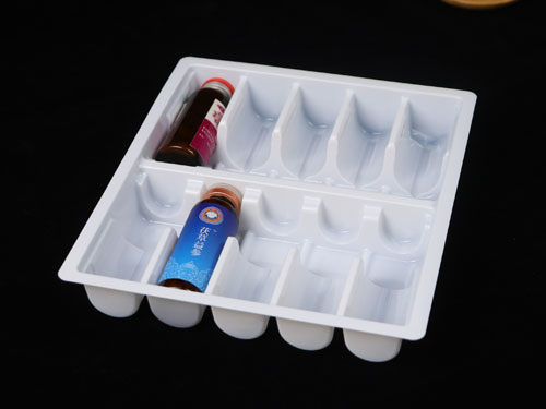 口服液塑料托,采用吸塑工艺将塑料硬片制成特定凹槽的塑料,将产品置于凹槽内,起到保护和美化产品的作用。吸塑:一种塑料加工工艺,主要原理是将平展的塑料硬片材加热变软后,采用真空吸附于模具表面,冷却后成型,广泛用于塑料包装、灯饰、广告、装饰等行业。吸塑包装:采用吸塑工艺生产出塑料制品,并用相应的设备对产品进行封装的总称。吸塑包装制品主要包括:泡壳、托盘、吸塑盒,同义词还有:真空罩、泡罩等。